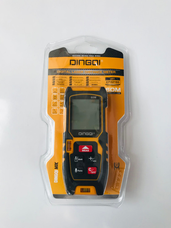 متر لیزری دینگی میزان اندازه گیری تا حداکثر تا ۶۰ متر ساخت کشور چین داری دو باطری 1/5 ولت فابریک